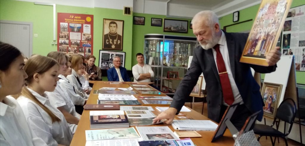 По поручению известного российского и кубанского иконописца, члена-корреспондента Российской академии художеств, руководителя Союза иконописцев имени Е.Н. Трубецкого Софьи Анатольевны Мачигиной, А.А. Соловьёвым был проведён яркий и содержательный урок духовности и патриотизма (с демонстрацией копий икон и портретов известных исторических деятелей Кубани, видеоматериалов об искусстве иконописи).