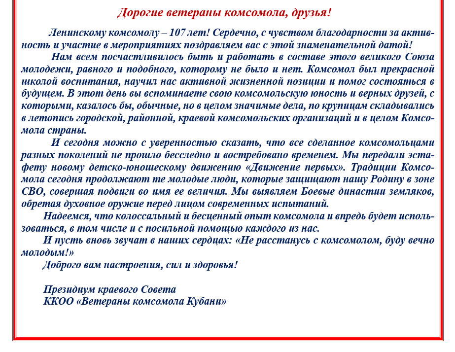 От имени членов Региональной общественной организации «Кубанское землячество», в своей молодости состоявших в рядах ВЛКСМ, сердечно поздравляем ветеранов комсомола Кубани с 107-й годовщиной Всесоюзного Ленинского Коммунистического Союза молодёжи!