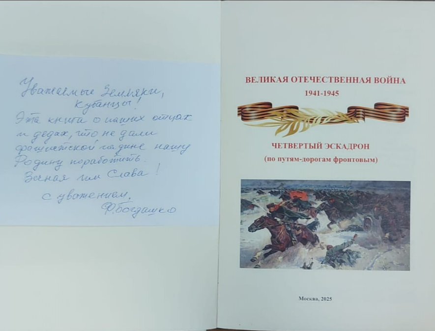 Пользуясь случаем, А.Г. Лихонин от имени землячества вручил важному гостю общественные награды, посвящённые 80-летию Победы в Великой Отечественной войне. Кроме того, Антону Петровичу были преподнесены в дар недавно изданные книги, авторство которых принадлежит активным членам РОО «Кубанское землячество». Речь идет о книге Ф.Н. Богдашко, содержащей многолетнее скрупулезное исследование подвига кубанских казаков в битве под Москвой и боевом пути 50-й кавалерийской дивизии, сформированной в июле 1941 года на Кубани,