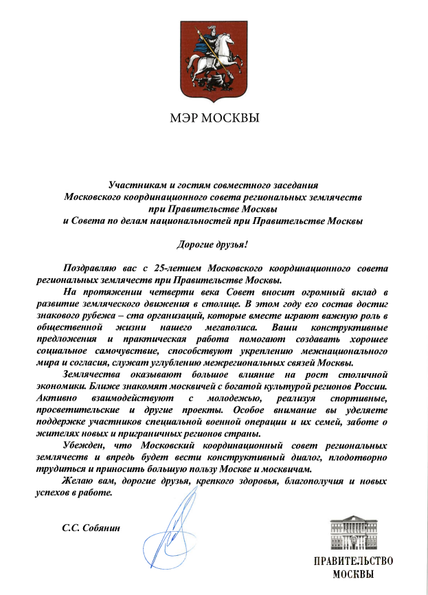 Как сообщается на сайте Правительства Москвы MOS.RU (https://www.mos.ru/news/item/163980073/), в завершающей части 2025 г. в столице состоялось совместное заседание Совета по делам национальностей при Правительстве Москвы и московского координационного Совета региональных землячеств при Правительстве Москвы. Представители этих двух крупных столичных общественных формирований в качестве основного вопроса рассмотрели и поддержали чрезвычайно важный в современных условиях проект Московской Стратегии национальной политики на ближайшее десятилетие, а затем, в торжественной обстановке подвели итоги 25-летней плодотворной работы Совета земляческих организаций при Правительстве Москвы, в числе которых и Региональная общественная организация «Кубанское землячество», которая в следующем году будет отмечать своё 30-летие.