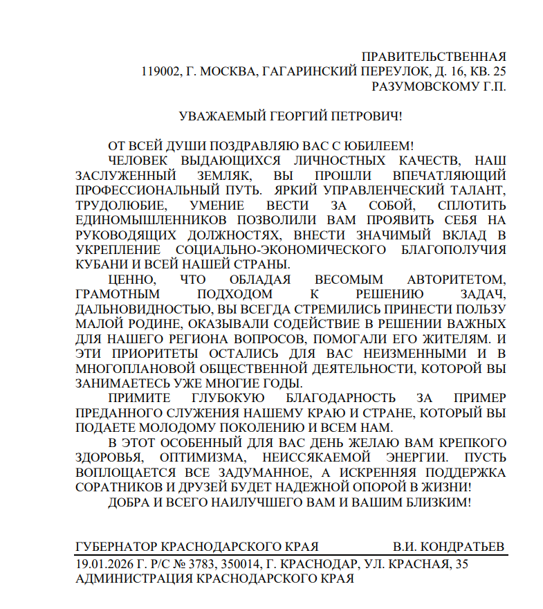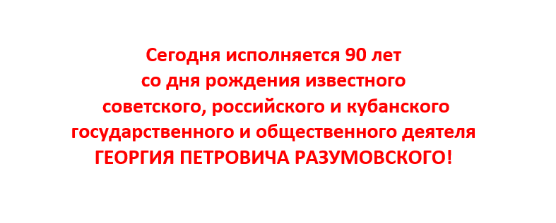 Региональная общественная организация «Кубанское землячество», активным членом которой является наш уважаемый юбиляр, сердечно поздравляет Георгия Петровича с этой большой и важной датой в его жизни, желает ему здоровья, благополучия и на многие годы такой же активной жизненной и гражданской позиции государственника и патриота нашей большой родины – России и малой – Краснодарского края!